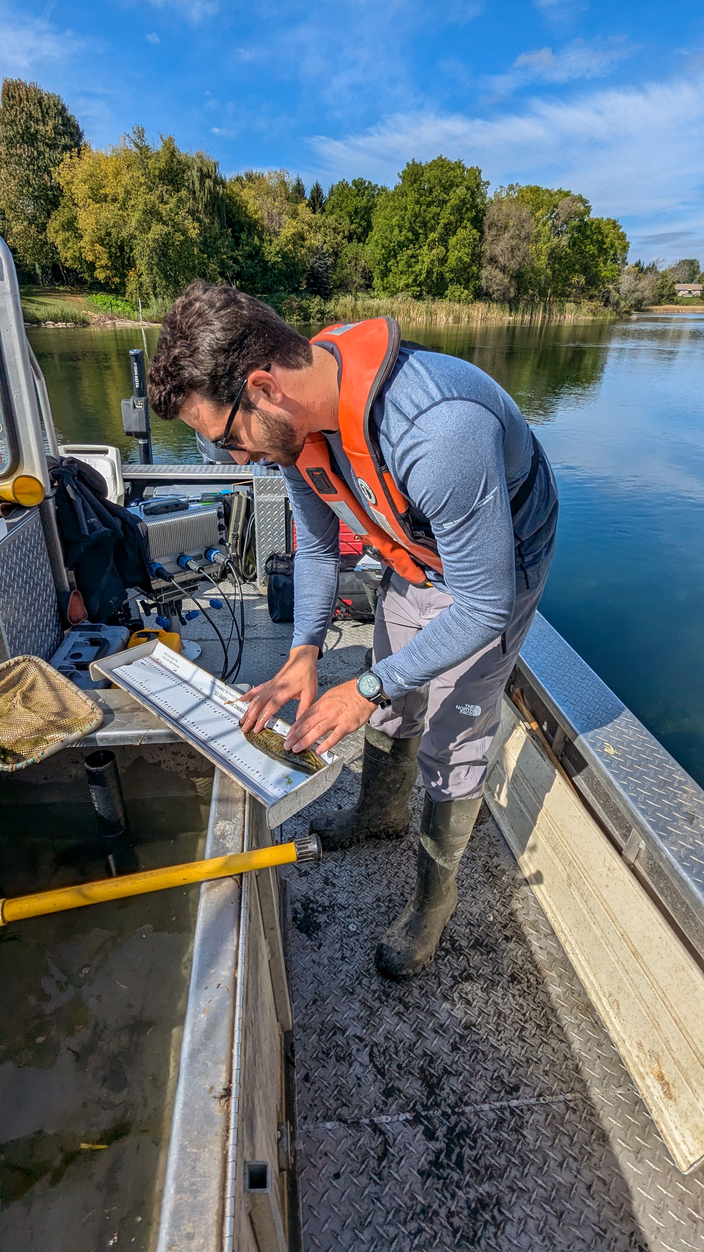Photo: Greg measuring a small Emerald Bowfin. The length of the captured fish was one of the data points collected during electrofishing.